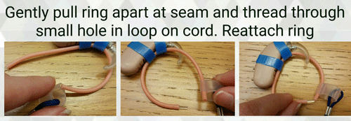 A plain blue hearing aid cord and clip for preventing hearing